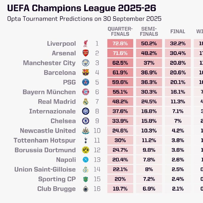 以上为各队晋级8强、4强、决赛概率 09月30日讯 欧冠联赛阶段第二轮开赛在即,opta超等贪图机更新了欧冠夺冠概率,其中利物浦位列榜首,阿森纳、曼城分列二三。 opta欧冠夺冠概率↓ 1.利物浦 18.64% 2.阿森纳 17.44% 3.曼城 11.45% 4.巴萨 10.51% 5.巴黎 10.31% 6.拜仁 7.83% 7.皇马 4.92% 8.国米 3.1% 9.切尔西 2.81% 10.纽卡 1.78% |