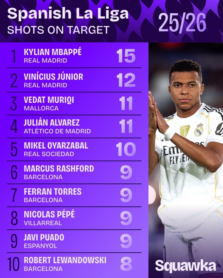 10月7日讯 日前,Squawka统计了本赛季西甲射正次数排名,姆巴佩15次居首。 1、姆巴佩(皇马):15次 2、维尼修斯(皇马):12次 3、维达特-穆里奇...