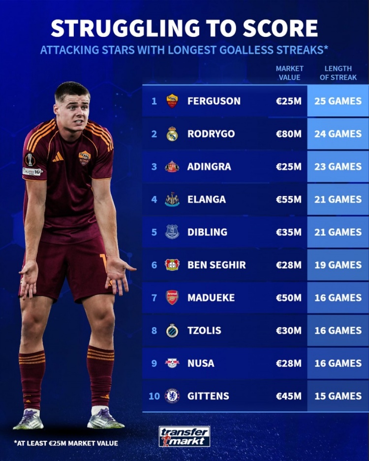 10月25日讯 德国转会市集盘货了迫切球员进球荒场次,并排出榜单,埃文-弗格森25场,罗德里戈24场。 德转盘货迫切球员进球荒(身价2500万欧+): 埃文-弗...