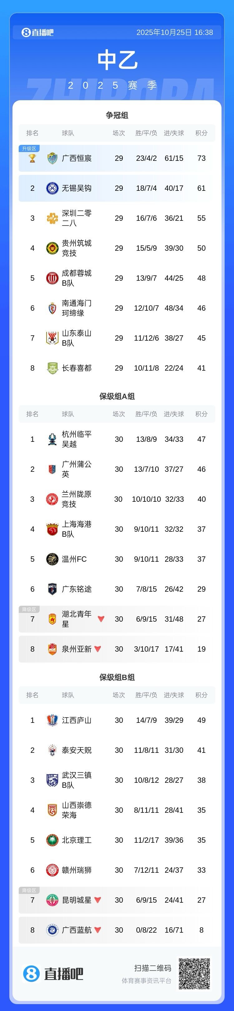 10月25日讯 2025赛季中乙联赛保级组规模一齐争夺,保级组A组,湖北后生星、泉州亚新左迁,保级组B组,昆明城星、广西蓝航左迁。 附中乙保级组第30轮赛况: ...