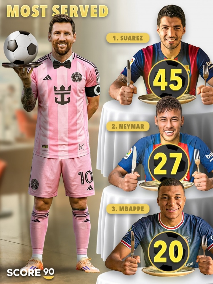 11月24日讯 好意思职联比赛,梅西1射3助引导迈阿密4-0完胜辛辛那提,晋级东部决赛。至此,梅西已处事生活助攻数已达404次。据score90数据统计,在梅西404次助攻中,最大的受益者是苏亚雷斯45次。 ■以下是梅西助攻对象名次榜: 1、苏亚雷斯 45次 2、内马尔 27次 3、姆巴佩 20次 |
