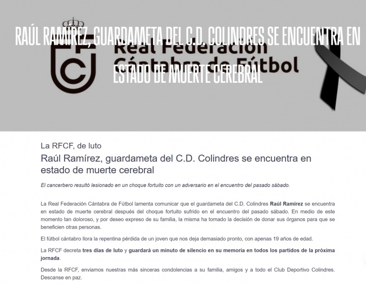 9月29日讯 西协甲球队科林德雷斯队门将劳尔-拉米雷斯因在上周六的比赛中头部受到撞击,至今晨晦气牺牲。皇马官方发文,对劳尔-拉米雷斯的离世暗示悲伤。 皇马官方公...