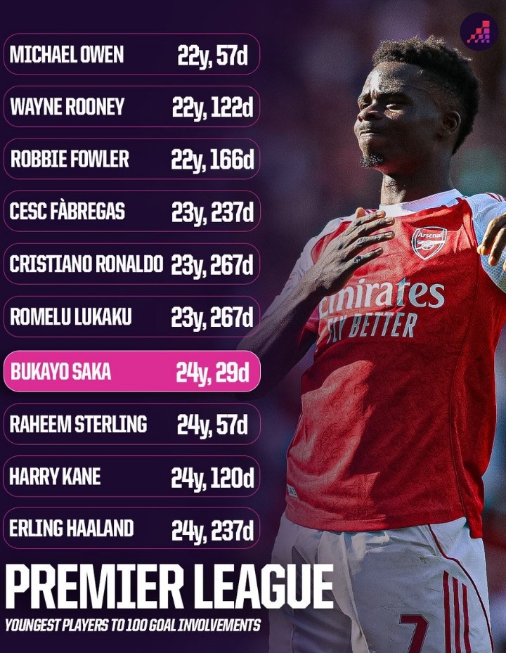 10月4日讯 在本轮英超阿森纳对阵西汉姆的比赛中,萨卡破门,已毕个东谈主在英超胜仗参与第100粒进球里程碑。 以下为英超历史已毕胜仗参与100球最年青记载榜,萨卡位列第7。 1、欧文 22岁57天 2、鲁尼 22岁122天 3、福勒 22岁166天 4、法布雷加斯 23岁237天 5、C罗 23岁267天 6、卢卡库 23岁267天 7、萨卡 24岁29天 8、斯特林 24岁57天 9、凯恩 24岁120天 10、哈兰德 24岁237天 |