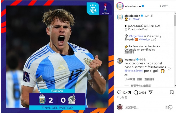 10月13日讯 世青赛(U20寰宇杯)1/4决赛,阿根廷2-0打败墨西哥,晋级四强。 阿根廷队社媒晒出海报庆祝晋级,梅西留言:“祝福小伙子们晋级半决赛,也恭喜西...