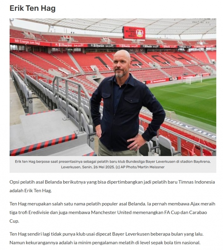 印尼媒体报谈截图 10月16日讯 印尼媒体Bola默示,接洽到印尼足协已任命了来自荷兰的期间总监和首席球探,新任印尼国度队主教养一样来自荷兰的可能性很大。报谈还称,大部分印尼裔球员均在荷兰缔造和成长,任命荷兰主帅会让疏通进程愈加顺畅。 该媒体就此对新任印尼主帅进行了瞻望:“哪些荷兰籍教养有后劲成为印尼国度队的新任主教养呢?以下是咱们的致密分析。” 马克·范博梅尔 首位有后劲成为印尼国度队新帅的荷兰籍教养是同为荷兰国度队传说的马克·范博梅尔。 范博梅尔被公觉得他阿谁期间最出色的防护型中场之一。他亦曾遵守于埃因霍温、巴塞罗那、拜仁慕尼黑和AC米兰等欧洲顶级俱乐部。 自2018年起,他决定开启教养生存,曾捏教埃因霍温、沃尔夫斯堡和皇家安特卫普,并携带皇家安特卫普获得比甲联赛、比利时杯和比利时超等杯冠军。当今他处于休闲情状,不错接洽成为帕特里克·克鲁伊夫的接任者。 弗兰克·德波尔 第二位可能成为印尼国度队新帅的荷兰籍教养东谈主选是弗兰克·德波尔。 手脚教养,德波尔曾捏教阿贾克斯、海外米兰和水晶宫等多家欧洲顶级俱乐部。但他的加分项在于,他曾在2020-2021年间捏教荷兰成年国度队一年。 自昨年2023年与阿布扎比半岛俱乐部离异后,德波尔尚未重返教养岗亭。德波尔与印尼足协总主席埃里克·托希尔接洽细腻,托希尔恰是曾在2016年任命他为海外米兰主帅的伯乐。因此,两东谈主有望在印尼国度队再度配合。 菲利普·科库 第三位可能成为印尼国度队新帅的荷兰籍教养东谈主选是菲利普·科库。 科库是荷兰闻明教养之一。他曾在2014年至2018年时辰携带埃因霍温在荷甲联赛占据统率地位。 这位前巴塞罗那球员自2023年与维特斯俱乐部离异后也正处于优游情状。科库还曾在2008年至2012年时辰担任荷兰国度队助理教养长达四年,因此他领有在国度级球队捏教的履历。 埃里克·滕哈赫 下一位可接洽成为印尼国度队新帅的荷兰籍教养东谈主选是埃里克·滕哈赫。 滕哈赫是荷兰籍教养中颇负有名的一位。他曾携带阿贾克斯获得三座荷甲联赛奖杯,并携带曼联获得足总杯和联赛杯。 滕哈赫本东谈主自几个月前被拜耳勒沃库森受命后,当今莫得捏教俱乐部。但是,他的不及之处在于缺少捏教国度级球队的警戒。 范布隆克霍斯特 临了一位可能接替帕特里克·克鲁伊夫的荷兰籍教养东谈主选是吉奥瓦尼·范布隆克霍斯特。 手脚球员,他被公觉得荷兰国度队历史上最优秀的中场之一。他曾经捏教过费耶诺德、格拉斯哥流浪者和贝西克塔斯等欧洲顶级俱乐部。 范布隆克霍斯特相较于前述候选东谈主的特有之处在于,他的父母两边齐领有印度尼西亚血缘。但问题在于,他当今是阿尔内·斯洛特在利物浦的助理教养,因此需要付出很是辛劳劝服他加入印尼国度队。 |