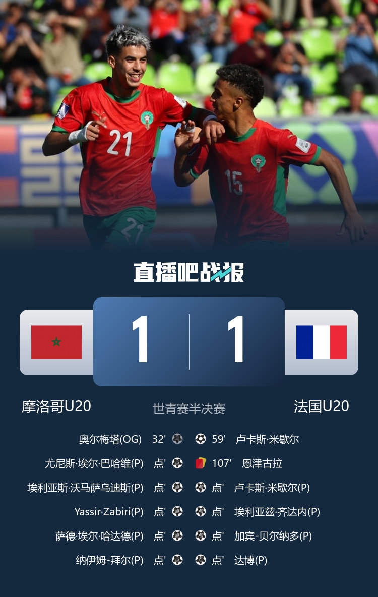 10月16日讯 世青赛半决赛,法国老例时辰1-1战平摩洛哥,最终在点球大战中落败,无缘决赛。 另一场半决赛在阿根廷与哥伦比亚之间进行,据ESPN统计,2009年之后,欧洲球队初次缺席世青赛决赛。 |