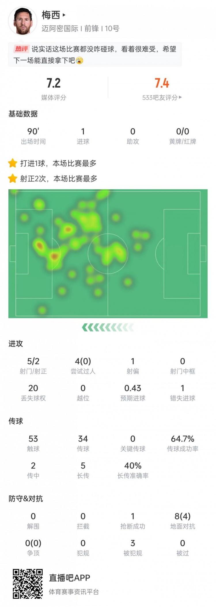 11月2日讯 好意思职联季后赛首轮第二场比赛,梅西破门,迈阿密国外客场1-2不敌纳什维尔,两队两回合战成1比1平局,将进行第三场比赛。 梅西本场比赛数据: 出场技术——90分钟 进球——1 射门——5(射正2) 尝试过东说念主——4(得手0) 射偏——1 丢失球权——20 预期进球——0.43 错失进球——1 触球——53 传球——34 传球得手率——64.7% 传中——2 长传——5(准确率40%) 抢断得手——1 大地起义——8(得手4) 被犯规——3 媒体评分——7.2 |