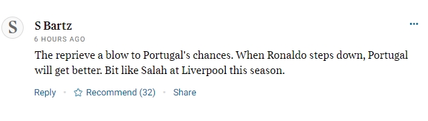 球迷4:这种款待对葡萄牙的胜算来说是一记重击。当C罗退下来之后,葡萄牙才会变得更好。有点像本赛季利物浦的萨拉赫。