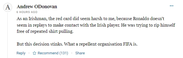 11月26日讯 昨晚多家媒体报说念,FIFA已对C罗在对阵爱尔兰的比赛中吃到的直红得出了措置决定,他将被禁赛3场,但有2场将脱期实行,这也意味着C罗不会因这张红牌缺席来岁葡萄牙的寰宇杯正赛。 音尘一出,激发了海外球迷的平淡热议: 《泰晤士报》对此事的报说念辩论区: 球迷1:行为爱尔兰东说念主,我个东说念主合计那张红牌给得太重了,因为从慢镜头回放来看,C罗似乎根柢莫得遇到爱尔兰后卫,他仅仅一直在试图挣脱对方反复拉扯他球衣的动作。但(国际足联)的决定烂透了。他们真的个令东说念主厌恶的组织。