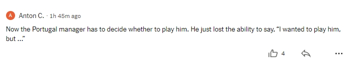 球迷9:目下葡萄牙主帅必须决定是否让他上场,他失去了说“我本来要让他上,成果...”的契机了。