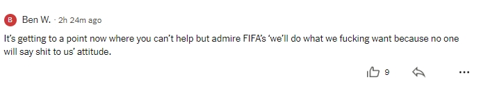 球迷5:好吧,确乎礼貌允许他们这样办。我会说这样让FIFA看起来很糟,但说白了他们从很久之前启动,就不在乎别东说念主如何看待他们了。
