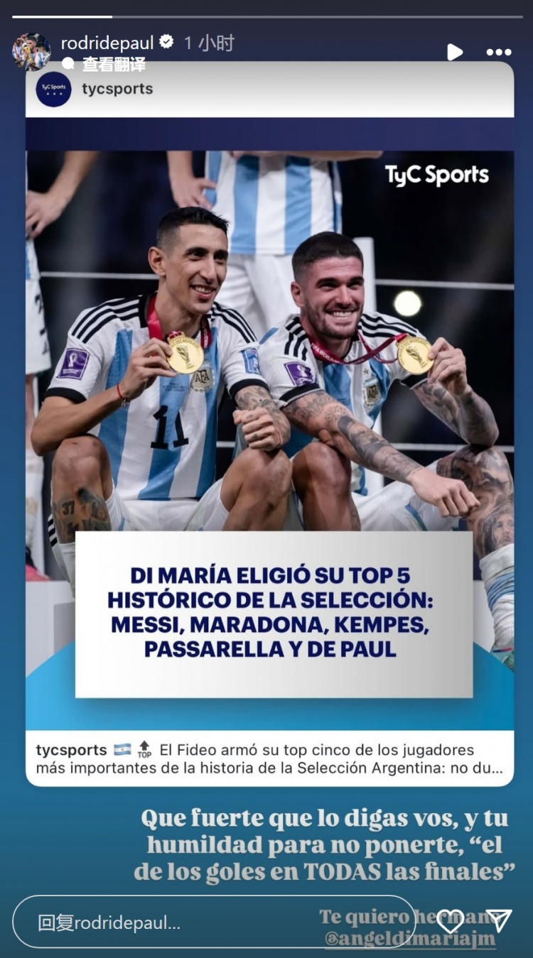 8月18日讯 德保罗更新社媒动态,恢复迪马利亚的采访本色。 迪马利亚接纳采访,列出了阿根廷队历史最伏击的5名球员,他们是梅西、马拉多纳、肯佩斯、帕萨雷拉和德保罗。 关于德保罗,迪马利亚说说念:“德保罗是球队形式中的枢纽东说念主物,他为国度队注入了新的活力,他不仅是球场上的发动机,还在团队凝合力和友谊纽带中弘扬伏击作用,尽管莫得辅导队长袖标,但他等于一位队长。” 德保罗社媒转发了迪马利亚的采访本色,并配文:“你这样说竟然令东说念主骇怪,况且你和顺地莫得将我方列入其中,尽管你是‘在悉数决赛中进球的东说念主。’爱你,兄弟。” |