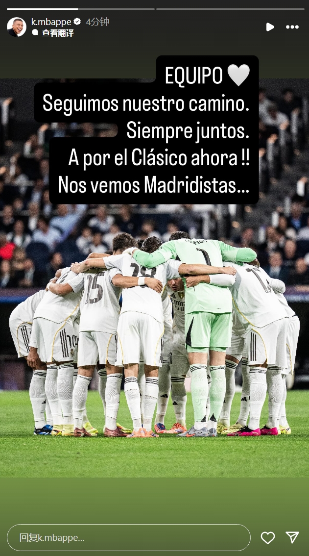 10月23日讯 在本轮欧冠,皇马1-0打败尤文。 姆巴佩也在赛后晒出全队合照,配文写谈:“团队奏效,咱们沿着我方的轨谈前进,耐久合营一致。咱们西班牙国度德比继续...