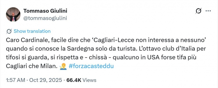 10月29日讯 据sempremilan网站报说念,卡利亚里俱乐部主席朱利尼(Tommaso Giulini),就AC米兰雇主卡迪纳莱(Gerry Cardinale)的言论通过支吾媒体作出恢复。 注:此前卡迪纳莱在接纳采访时说:“在好意思国,没东说念主蓬勃看卡利亚里对阵莱切的比赛,这是个问题。竞争是体育的实质,但这种竞争并未带来相应的经济薪金。咱们无法为(意甲比赛)外洋转播权签下高额合约,原因安在?因为转播商只思要最顶级的赛事,这亦然欧洲超等联赛这一倡导会出现的原因。” 朱利尼写说念:“亲爱的卡迪纳莱,当你对(卡利亚里主模式在地)撒丁岛的了解仅限于搭客视角时,说‘没东说念主热心卡利亚里对阵莱切的比赛’会很容易。当作意大利球迷数目名轮番八的俱乐部,卡利亚里既有不雅众关注,也备受尊重。何况谁知说念呢,在好意思国,冒昧维持卡利亚里的东说念主比维持米兰的还多(注:在好意思国有好多来自撒丁岛侨民的后裔)。” |